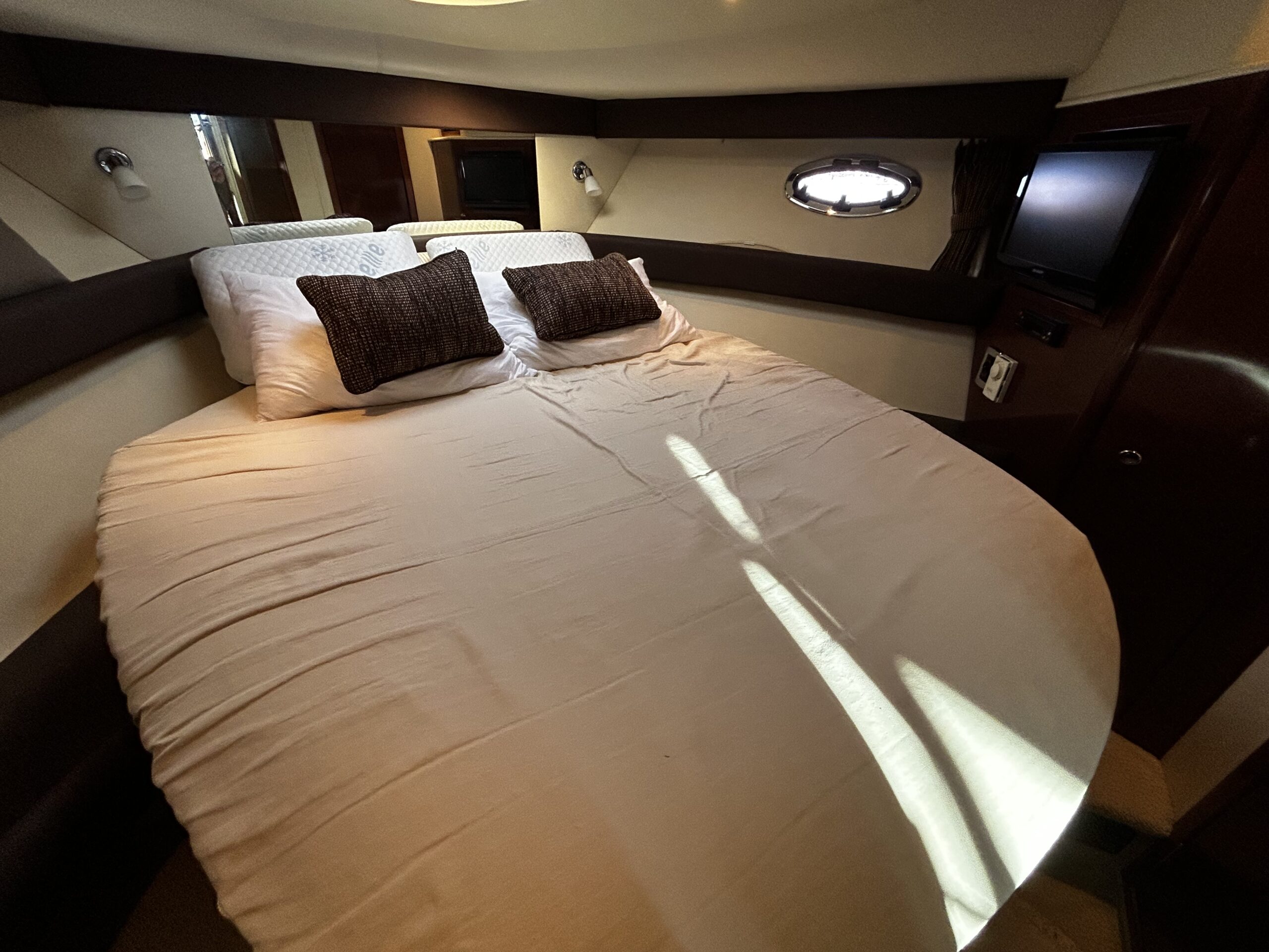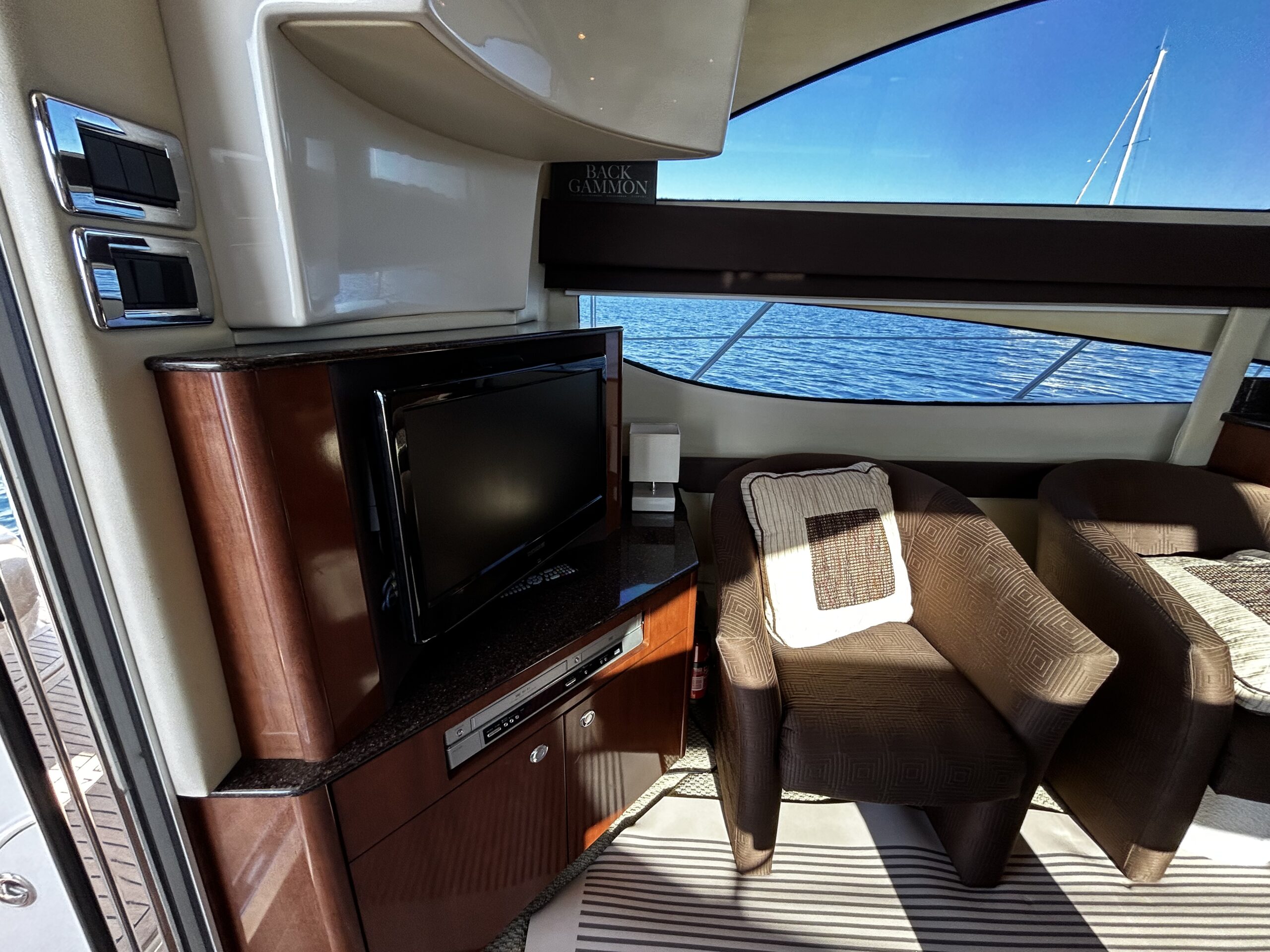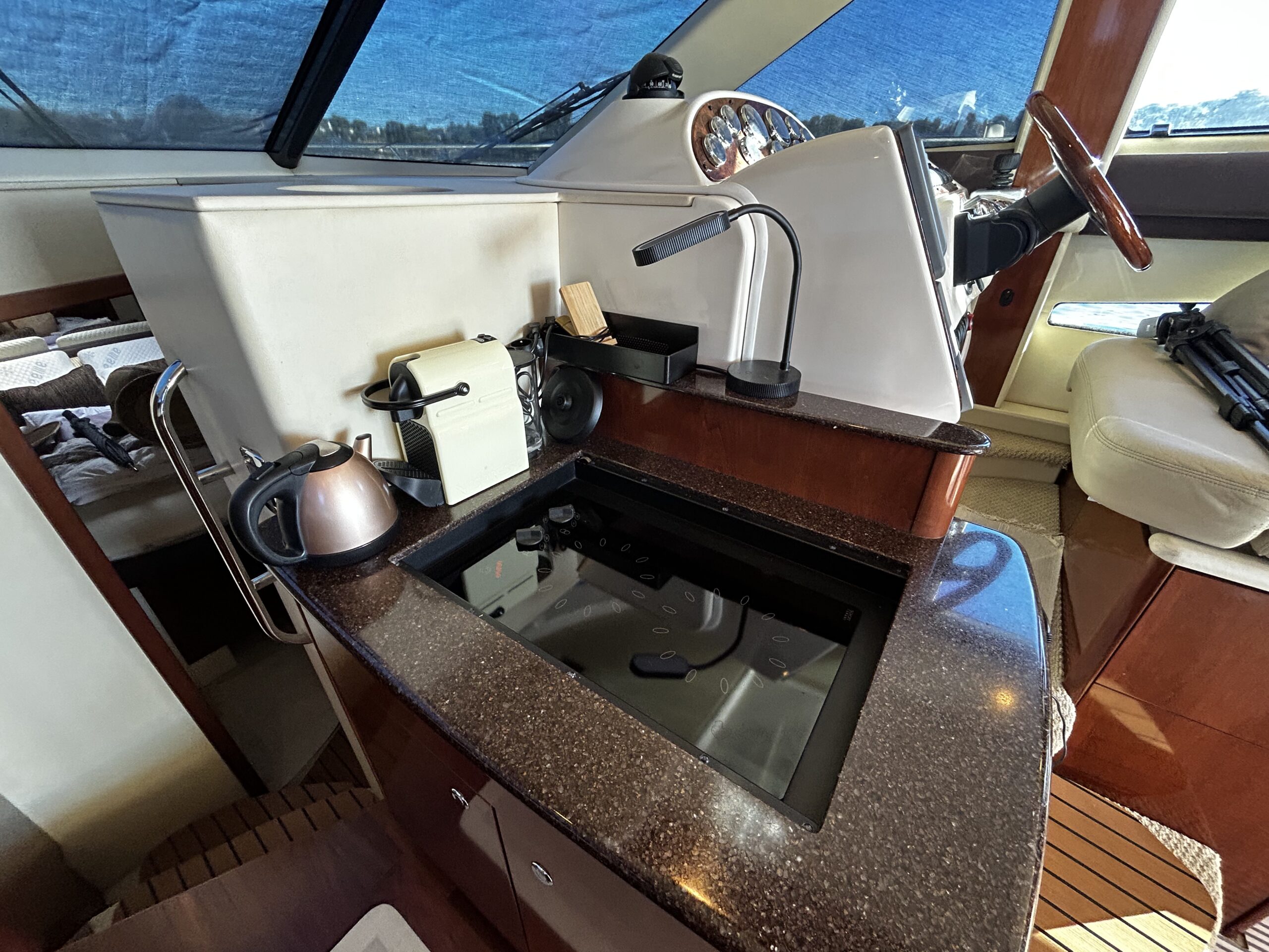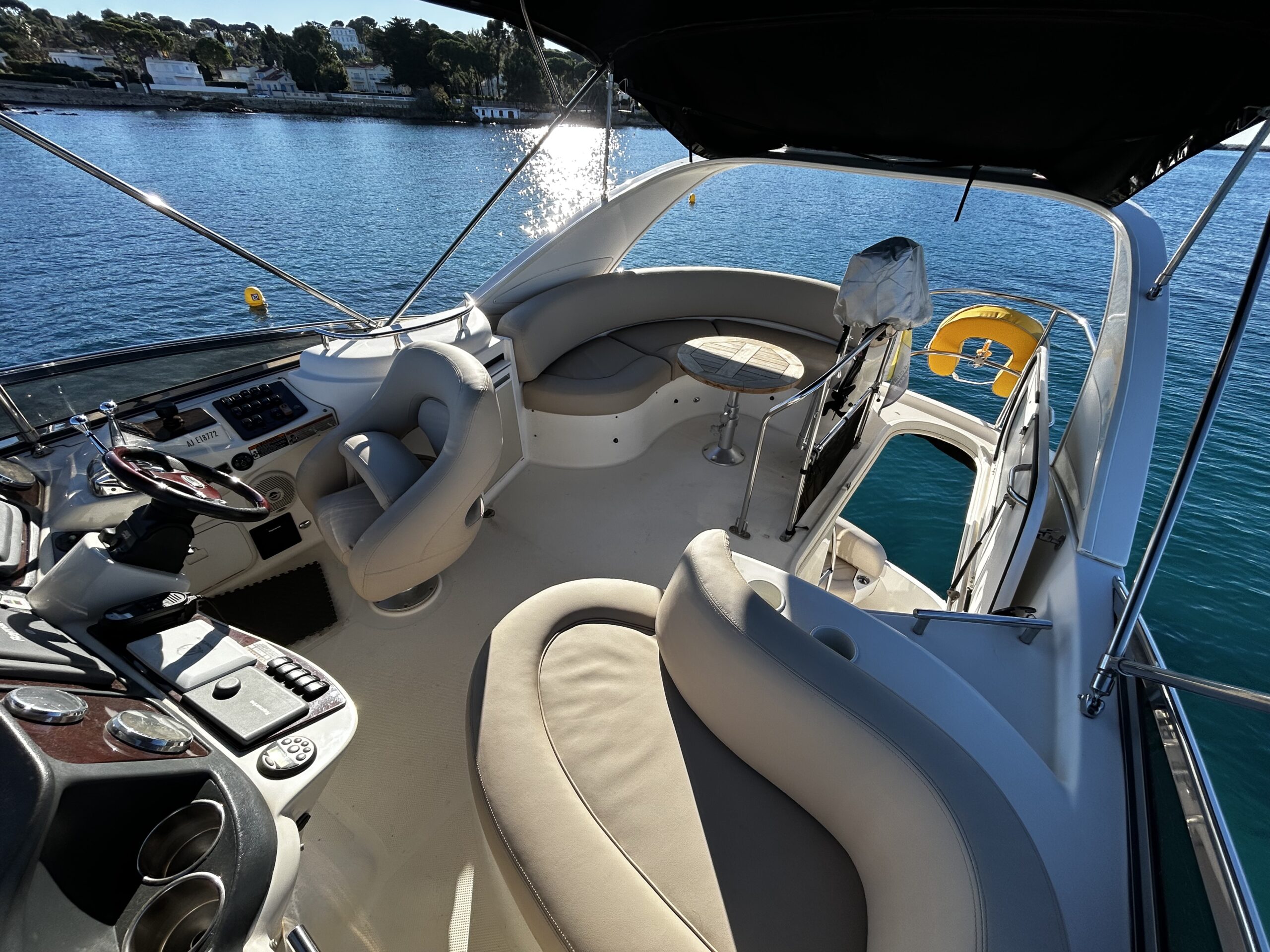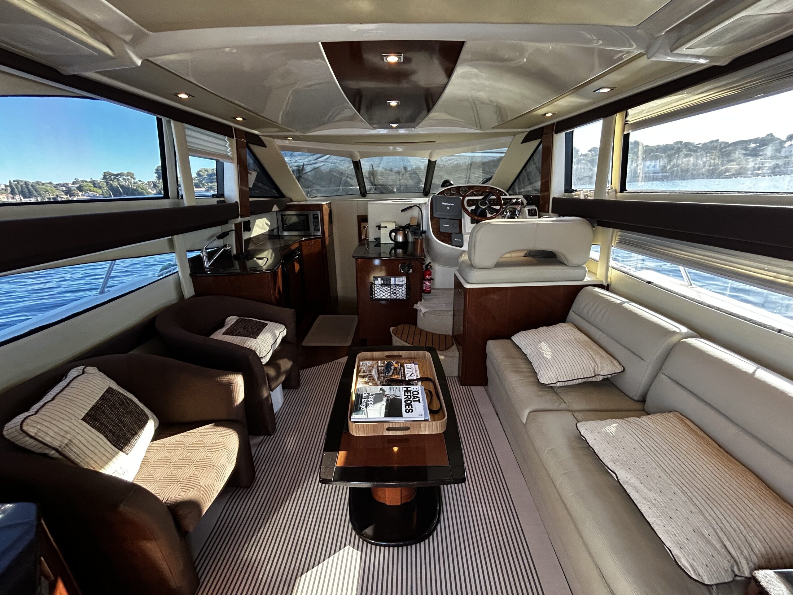 The interior is exceptionally spacious for its size, featuring a bright salon with panoramic views, a fully equipped galley, and two comfortable cabins ideal for accommodating family and guests.