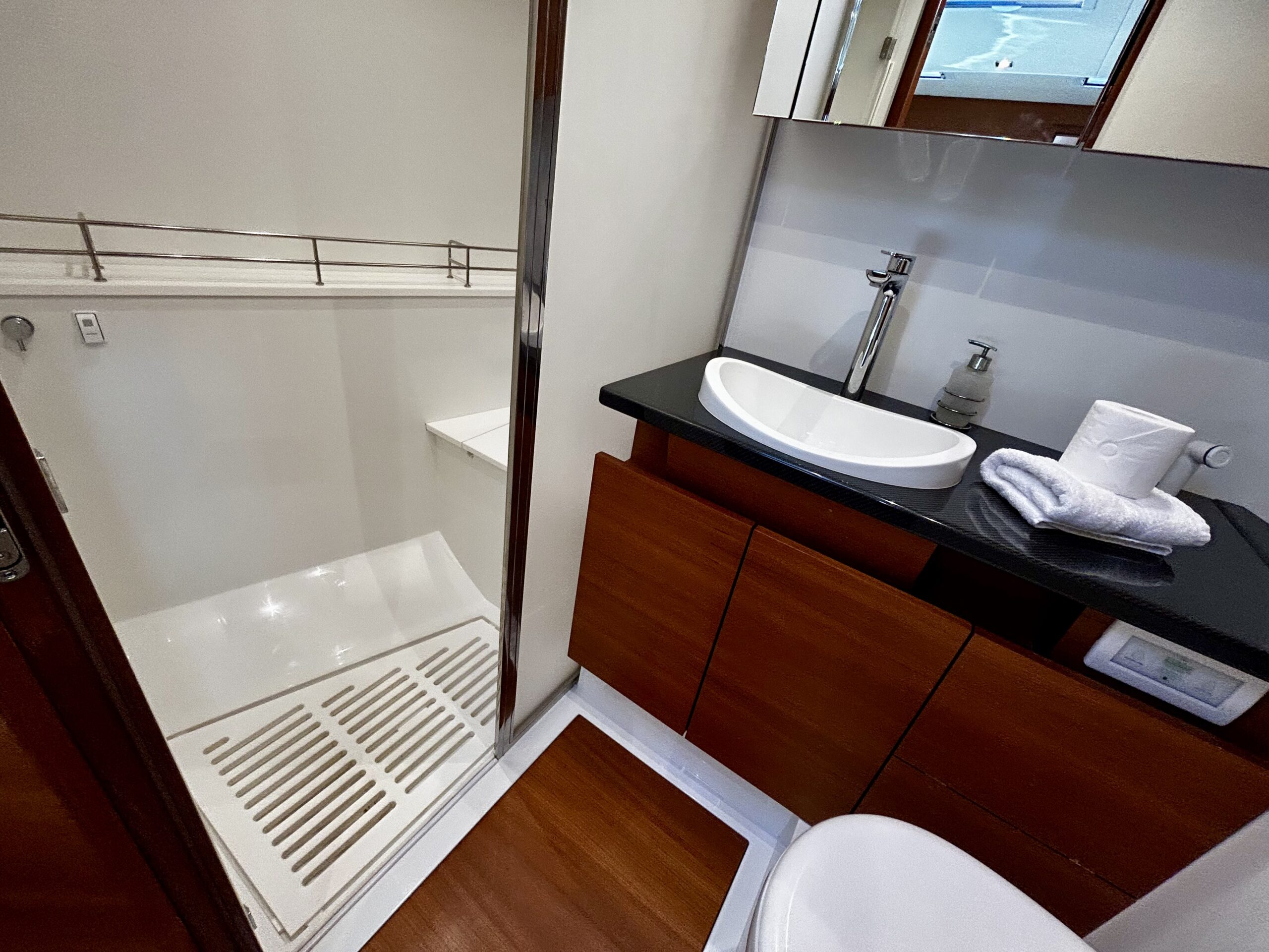 • Exterior Comfort: Full teak deck, hydraulic swim platform, longitudinal tender garage, carbon gangway, full cockpit cushions.