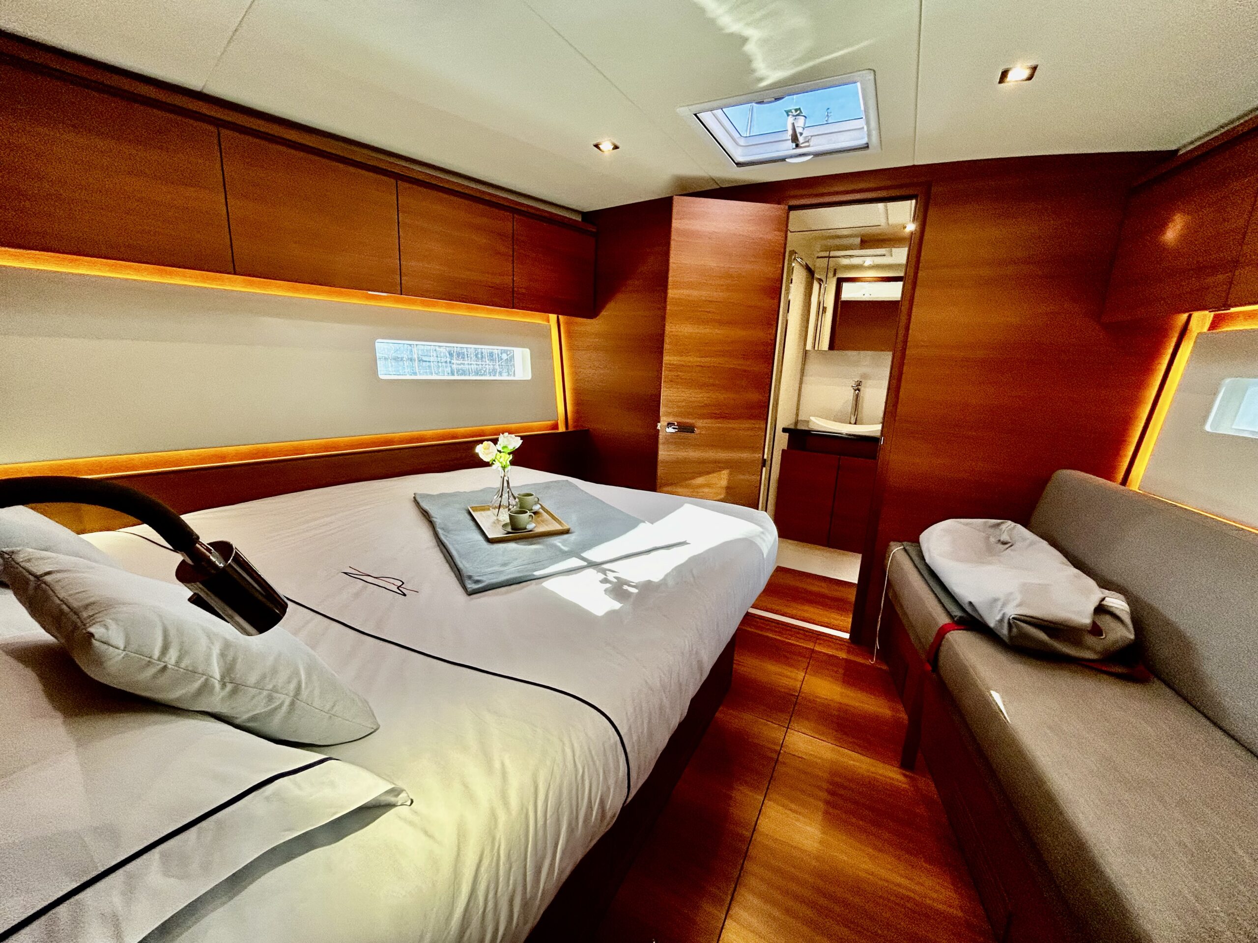 • Gréement & Voiles : Mât traversant, Enrouleur de génois électrique, Voiles North Sails 3Di Endurance, Code 0 sur emmagasineur, Winchs électriques Harken.