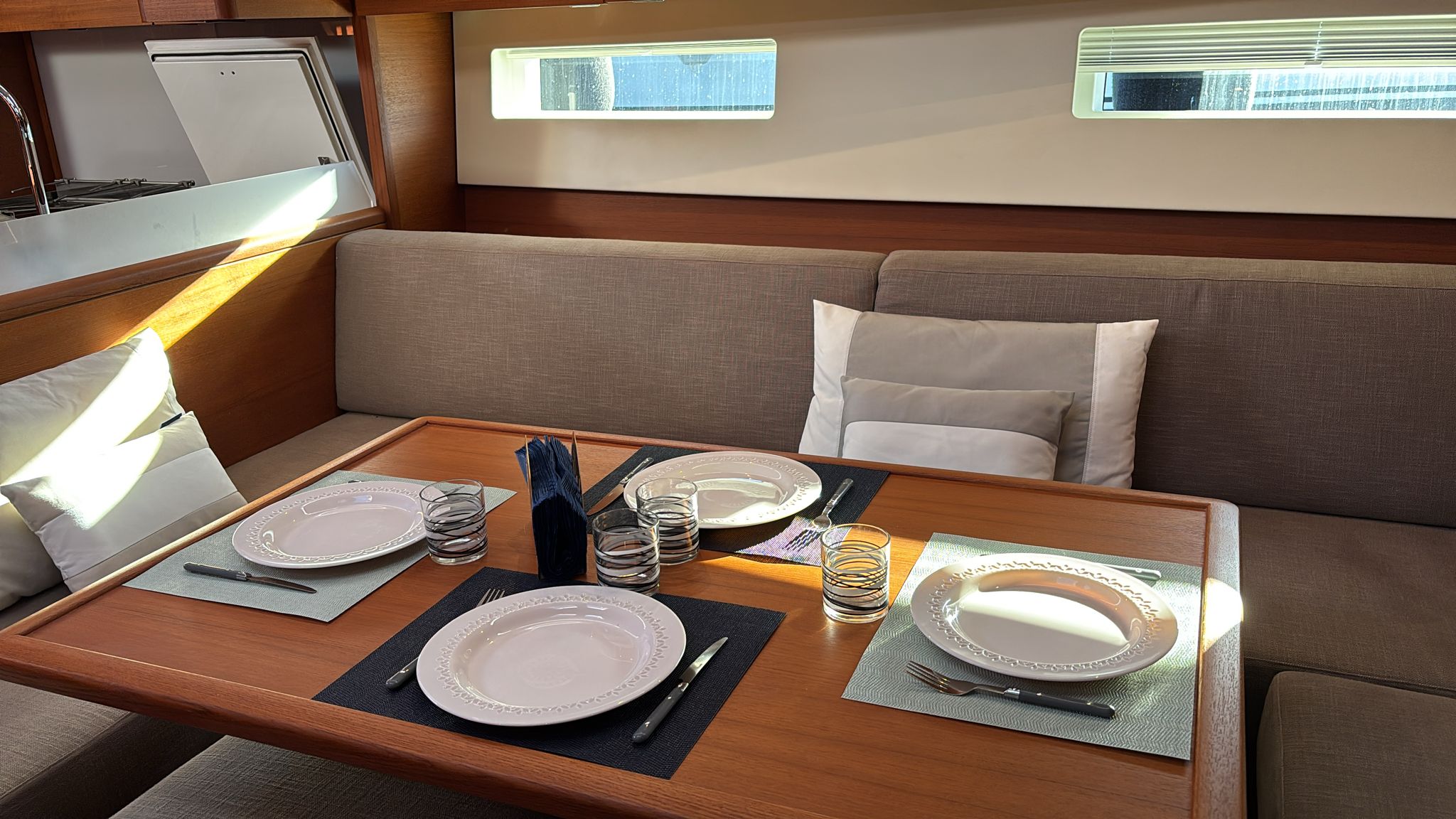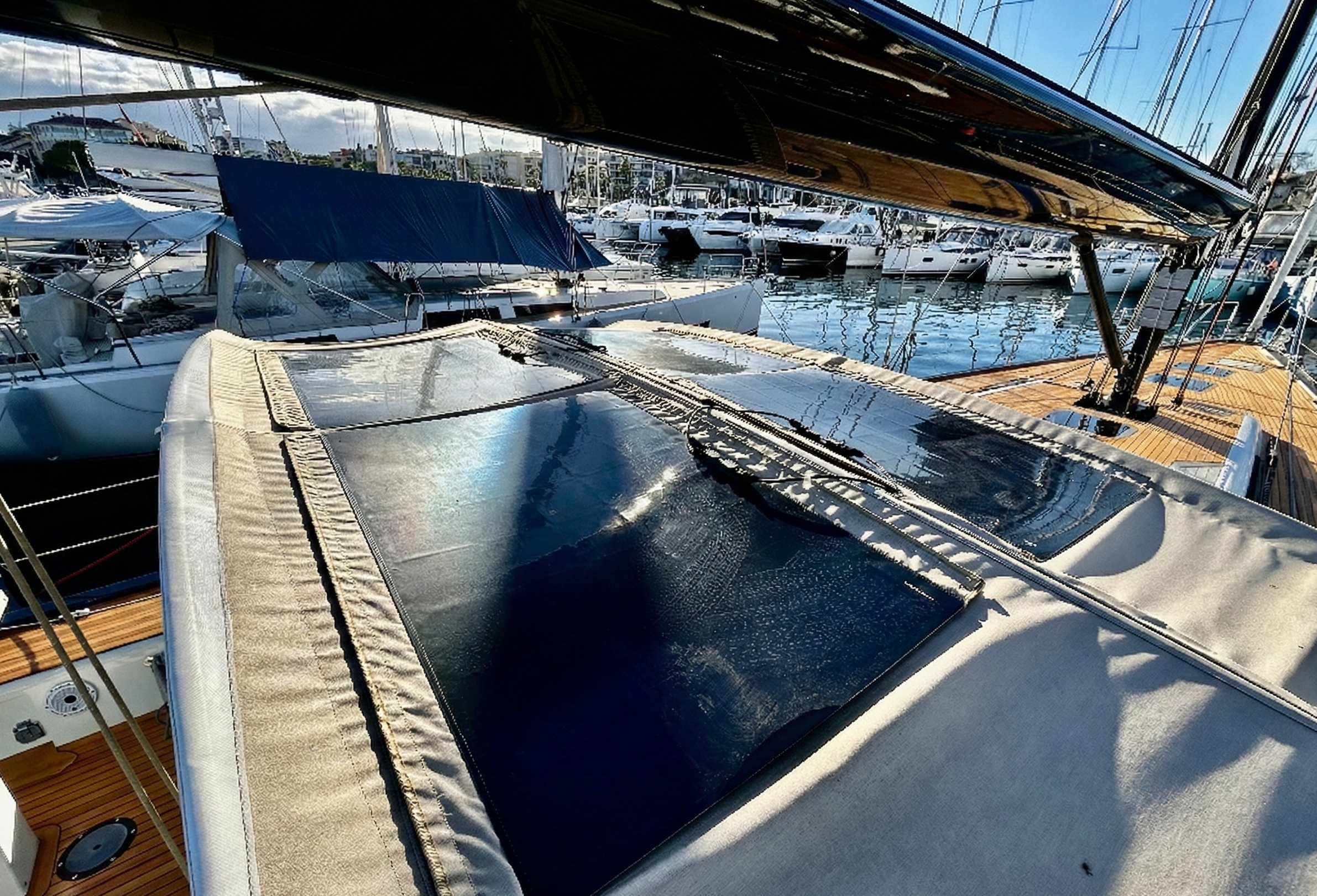 Ce Solaris 55 de 2022 est exactement cette réponse. Dessiné par le légendaire Javier Soto Acebal, il incarne l’équilibre parfait entre esthétique minimaliste et puissance marine. Là où d’autres constructeurs font des compromis, Solaris impose ses standards : pont flush en teck, lignes tendues et une raideur à la toile exceptionnelle.