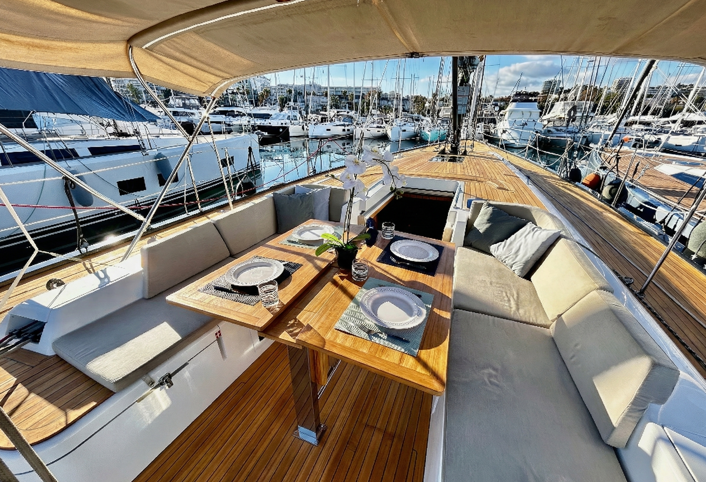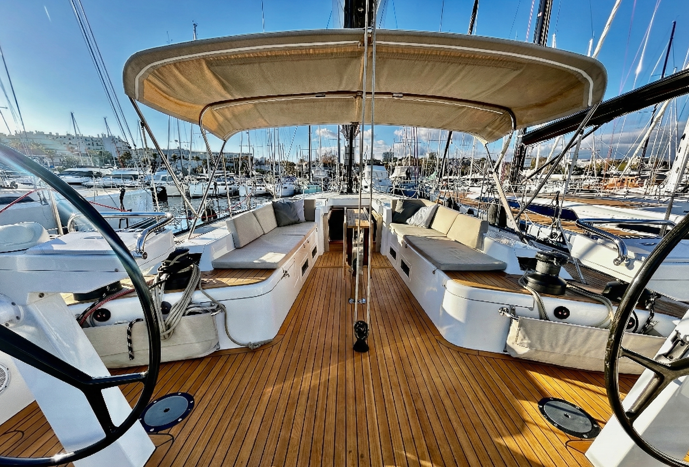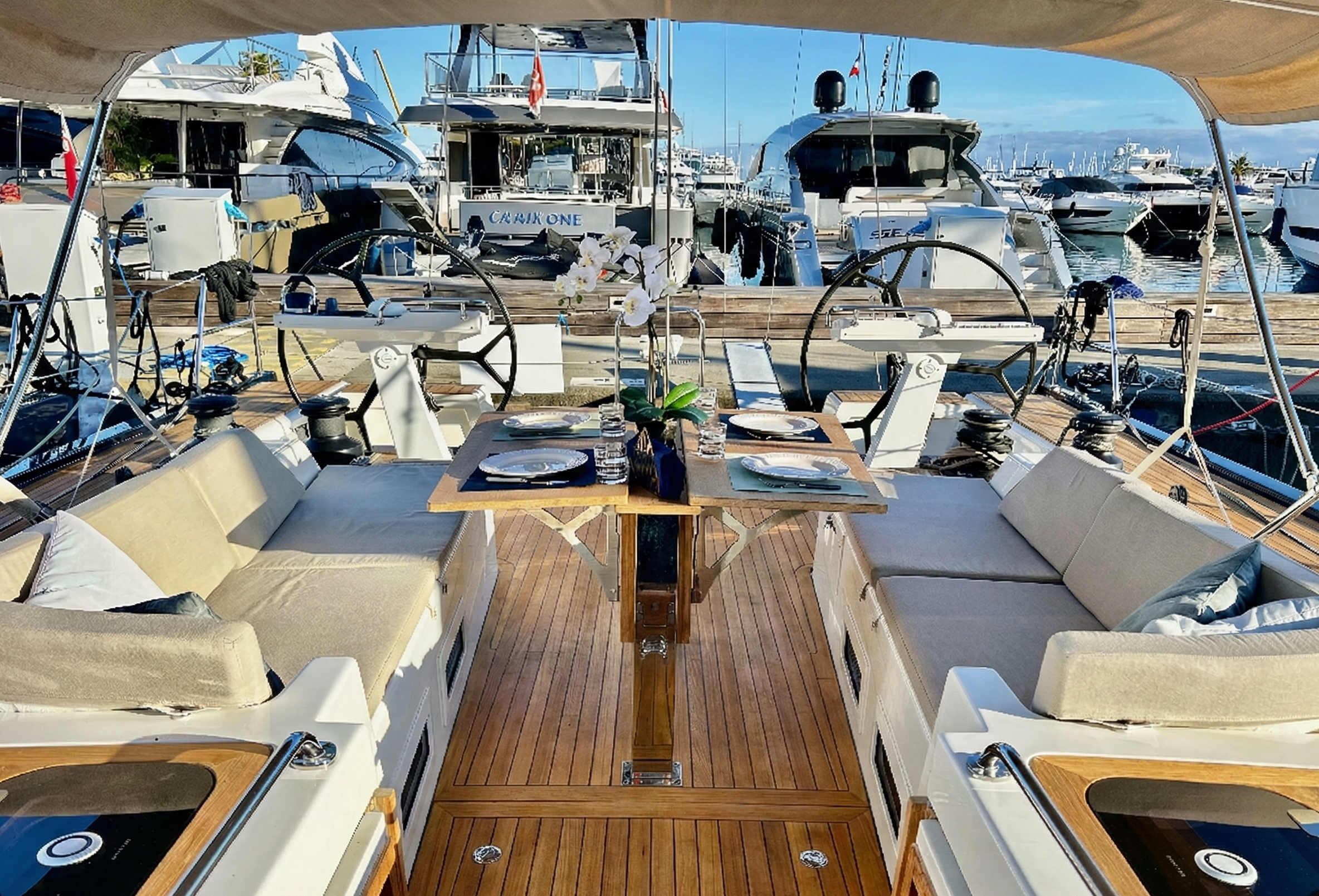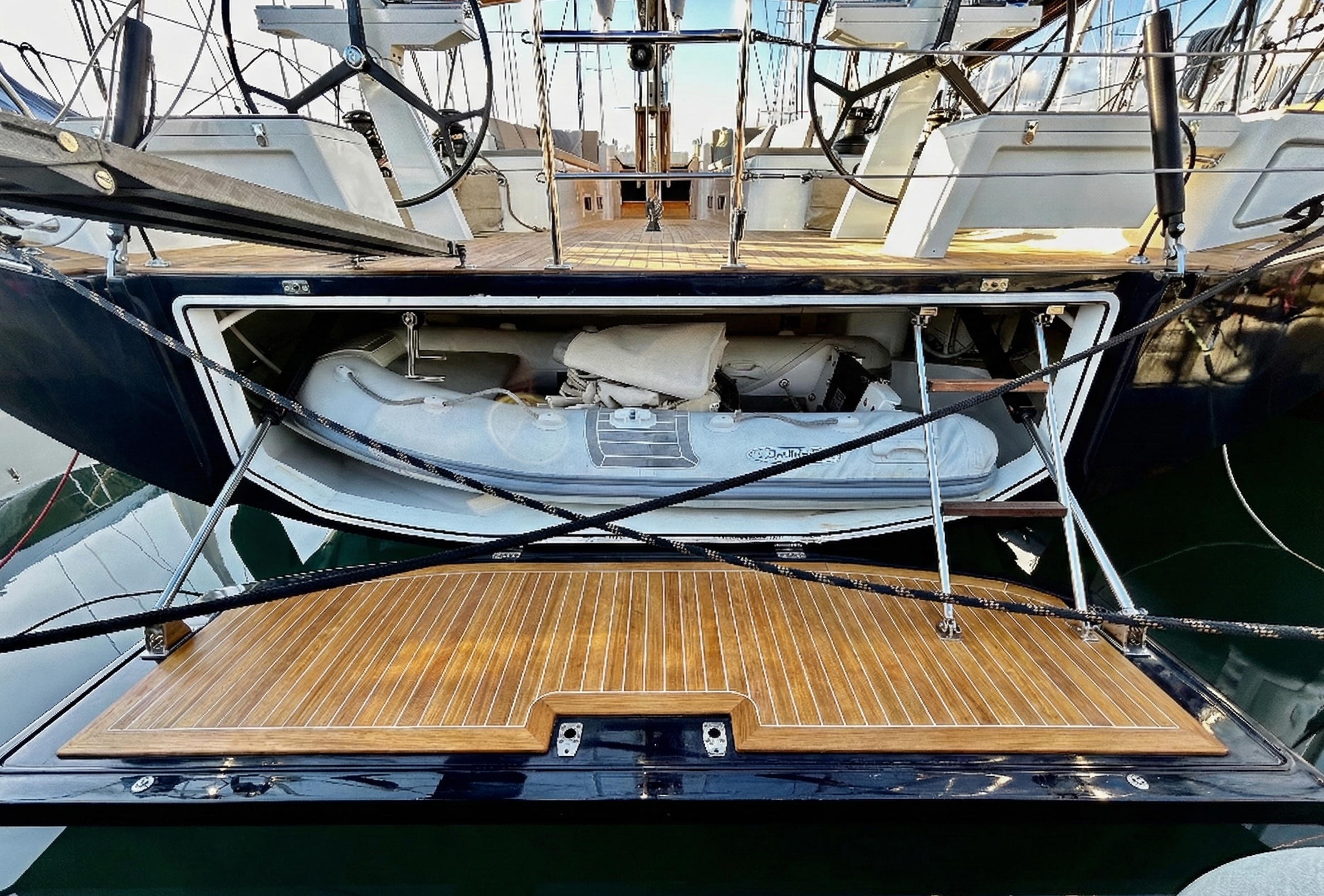 • Confort Extérieur : Pont intégralement en teck, plateforme de bain hydraulique, garage à annexe longitudinal, passerelle carbone, coussins de cockpit complets.